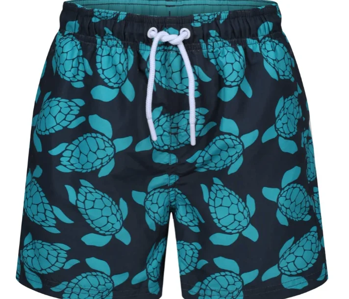 Su ajuste cómodo, con cintura elástica y cordón ajustable, permite libertad de movimiento y un ajuste seguro. El diseño en azul marino y turquesa añade un toque fresco y veraniego, ideal para niños activos y con estilo.