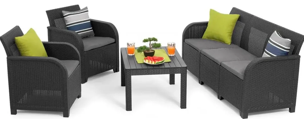 Convierte tu terraza, porche o jardín en un espacio de relax con estilo gracias al conjunto de jardín Sanremo de KETER. Este set incluye dos sillones individuales, un sofá de tres plazas y una práctica mesa auxiliar, ideal para disfrutar de reuniones al aire libre con familia o amigos.